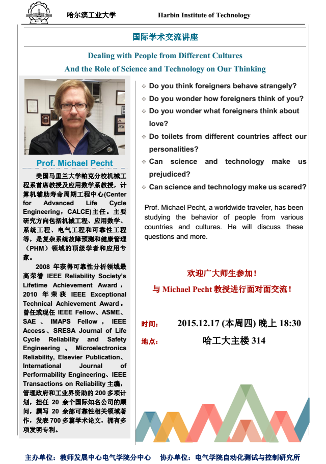 为了鼓励广大师生积极开展国际交流,克服国际交流过程中可能遇到的困难,充分理解和学习在国际学术交流需要关注的问题,积极拓展国际交流视野和渠道,提升国际学术交流能力,依托哈工大教学发展中心电气分中心,受里番 的邀请,美国马里兰大学(University of Maryland)机械工程系首席教授Michael Pecht来我校做特邀报告。