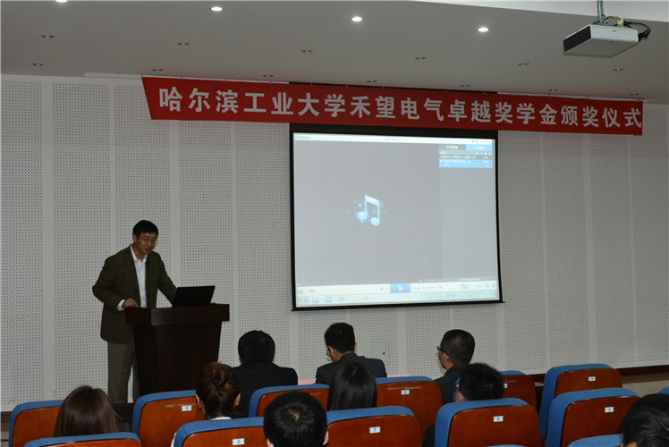 颁奖典礼上,首先由杨雪代表校方致欢迎词,她对支持哈工大教育事业、为里番 提供奖学金的禾望电气公司表示感谢;郑大鹏代表捐赠单位致词,对禾望电气有限公司作了简要介绍、回溯了与哈工大的交流和沟通,并鼓励广大同学抓住机遇,努力学习。李岩松宣读禾望电气卓越奖学金获奖名单及金额,本次禾望电气卓越奖学金评定委员会共评选出一等奖学金2人,二等奖学金7人,三等奖学金15人。校企领导共同为获奖学生颁奖。