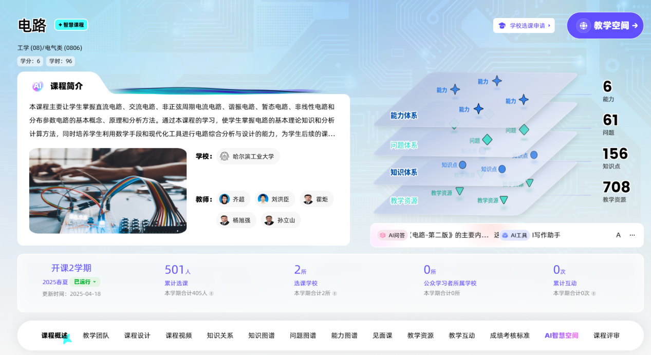 为积极推进人工智能技术与教育教学的深度融合,齐超教授团队建设了“基于知识图谱的AI+电路智慧课程”,该课程已在智慧树网上线共享运行;出版了《工程电路分析基础》新形态教材。智慧课程注重以能力培养为目标、以问题解决为核心、以知识体系为基础、以教学资源为支撑,包括708个教学资源、156个知识点、61个问题、6个能力体系(如图4所示);新形态教材注重工程应用案例,同学们扫描二维码就可以了解到相关知识点的最新科研成果和典型工程案例,实现了优质教学资源整合与共享,构建了课程的完整知识架构,确保学生能够系统地掌握学科的核心知识点,基于知识图谱显著提升了学生的课堂学习成效。