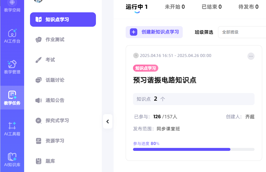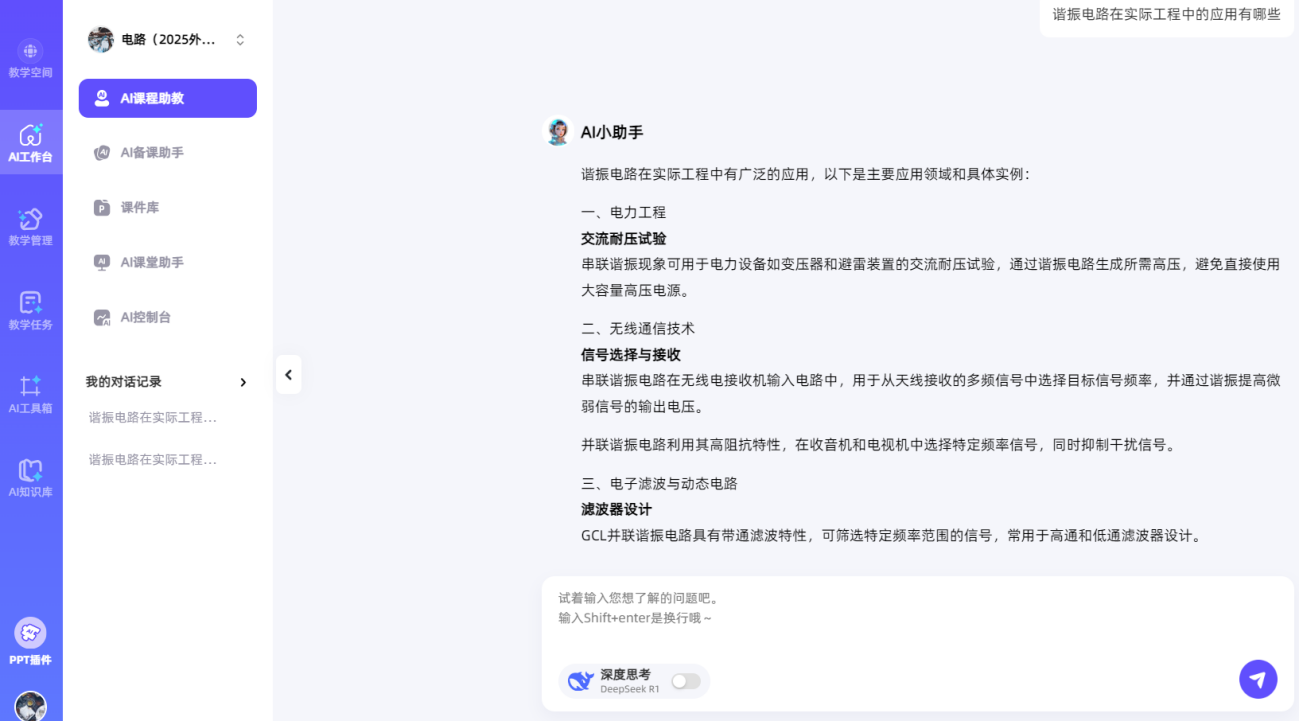 本次同步课堂,课前齐超老师与新疆工程里番 杨斌山老师共同开展教学研究备课会,研讨教学方案,通过智慧课堂发布预习任务(如图1所示),学生自主学习提升同步课堂教学效果。课上齐超老师基于BOPPPS教学模式讲授了“谐振电路”的相关知识(如图2所示),并利用AI课堂助手和AI工作台课堂时光机实时发布课堂测试、得到学生作答反馈情况。首先从力学共振、声学共鸣、电学谐振中的经典案例入手引入谐振概念,介绍了网络函数和谐振电路的基本知识点,通过互动式教学方法生动地讲解了串/并联谐振电路的特点(如图3所示);再以谐振电路在无线电能传输中的应用实例,将科研成果深度融入教学;并引出该领域有待解决的关键问题,引导学生课后查阅相关资料掌握最新学术前沿,激发了学生从事科学研究的兴趣。课上齐超老师将电路中的同频共振现象与同学们的奋斗目标与中华民族伟大复兴紧密联系,将课程思政潜移默化地融入教学。